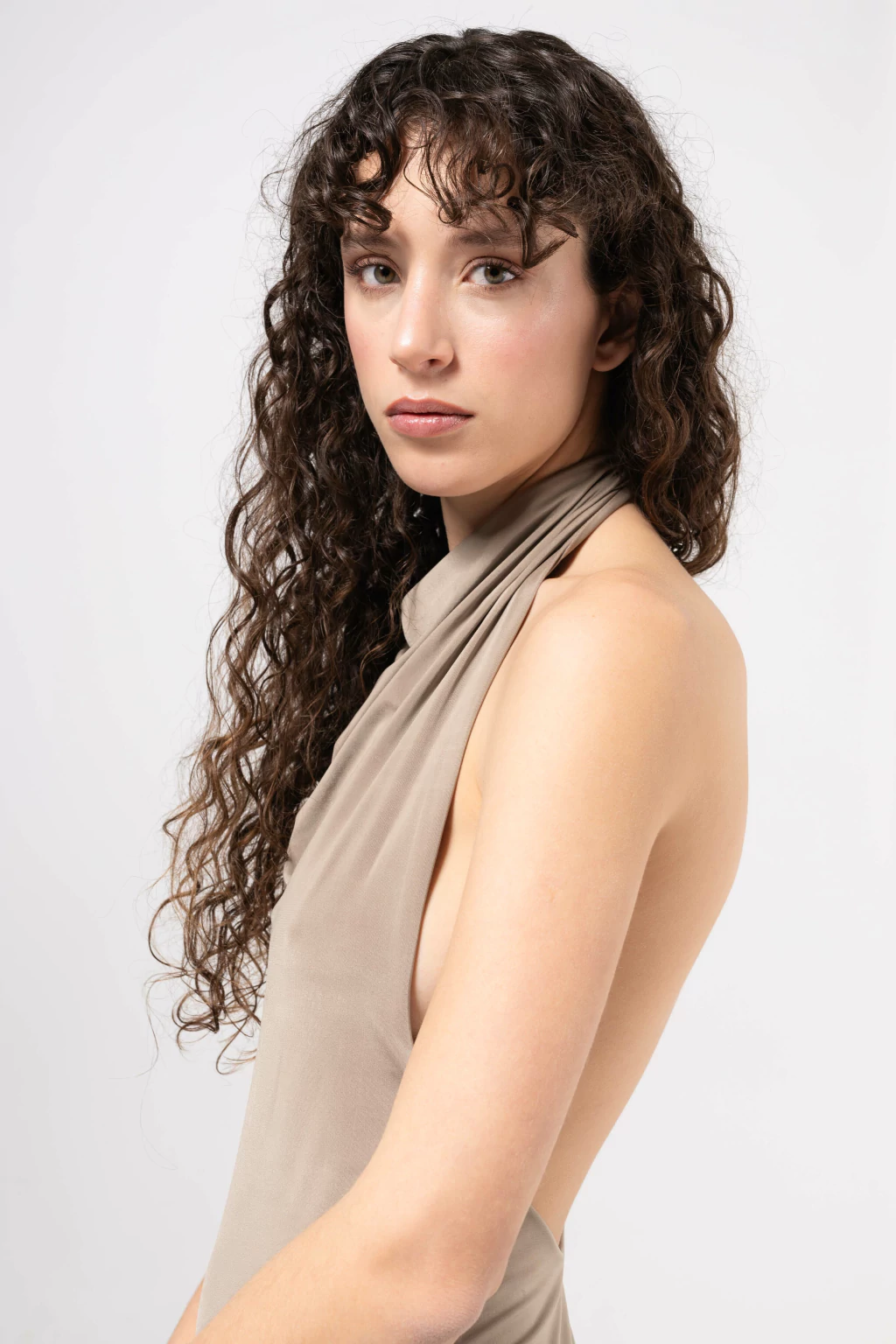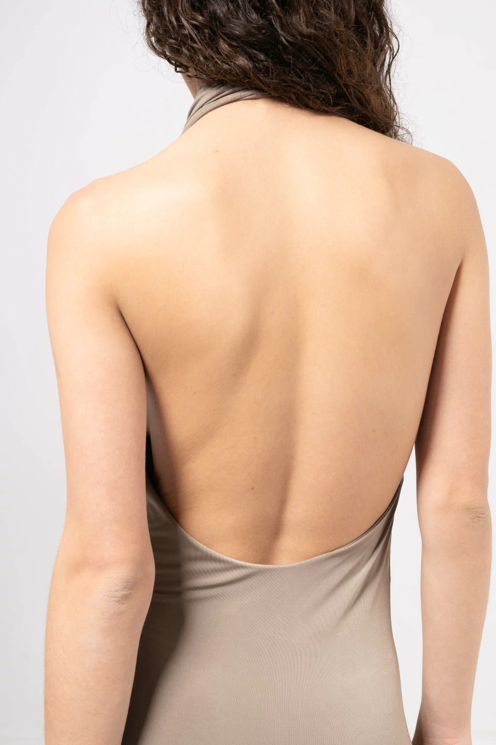 Vestido midi entallado con escote buche alto. Espalda con escote redondeado hasta la cintura. Confeccionado doble y embolsado en el mismo género.